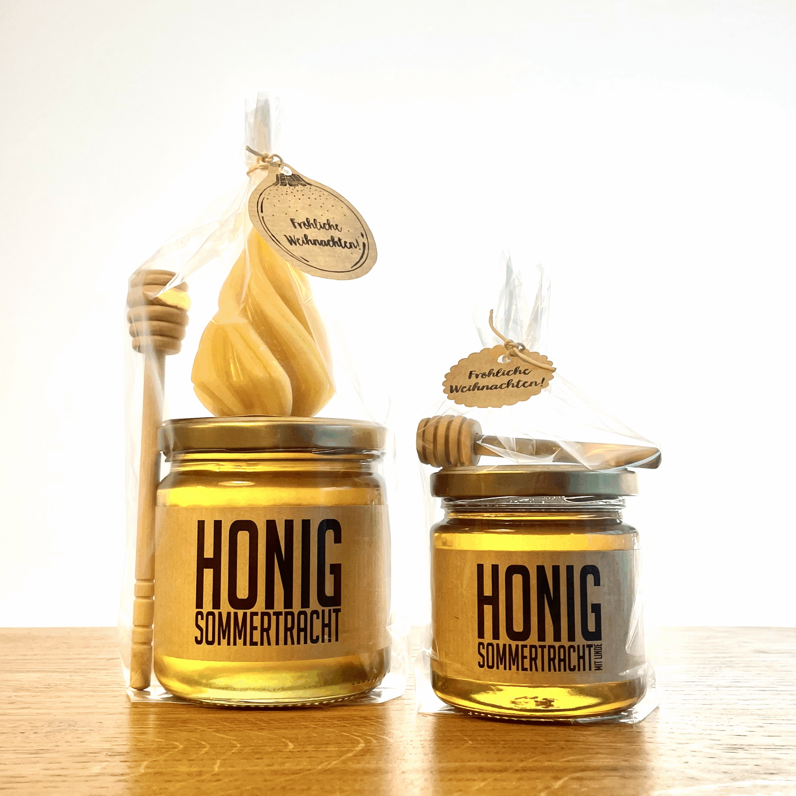 Beide Geschenke enthalten unseren einzigartigen Sommerblütenhonig mit Linde (250g oder 500g), jeweils mit einem Honiglöffel in entsprechender Größe.